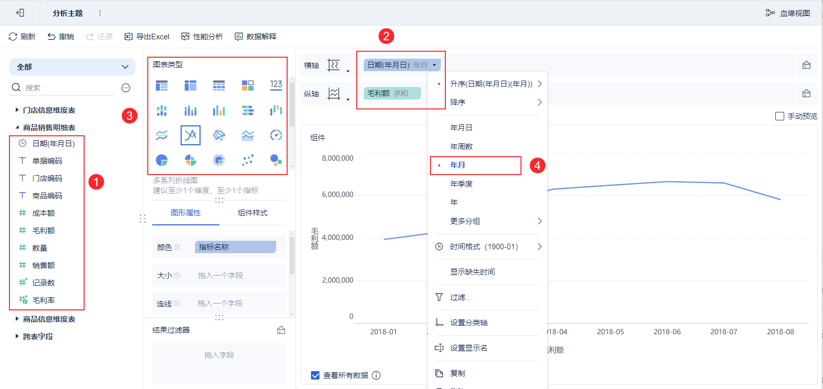 从待分析区域中拖拽日期至横轴,毛利额至纵轴,选择图表类型为折线图,将日期按年月划分。
