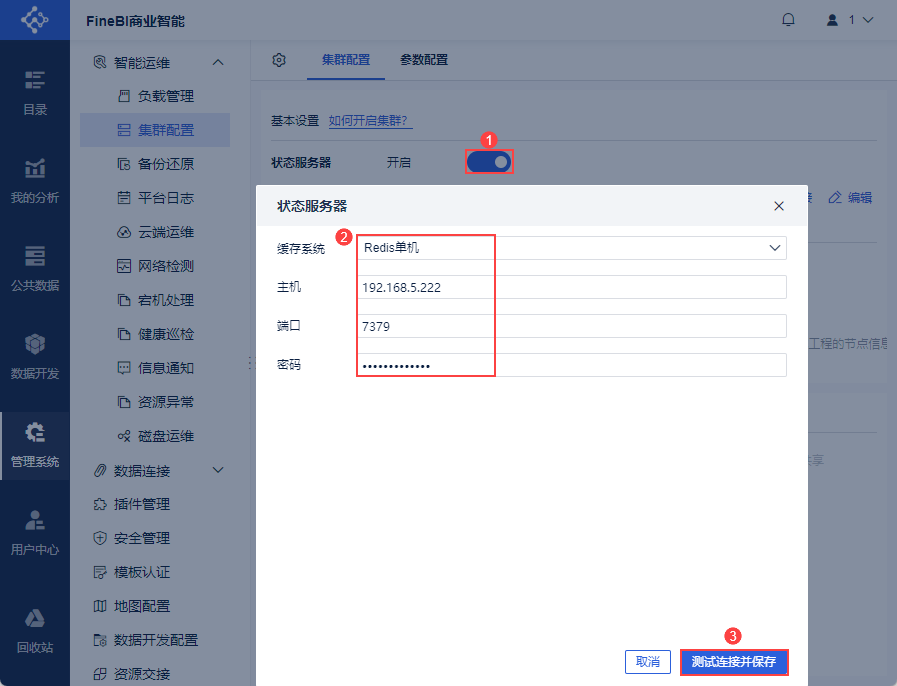 管理员登录FineBI系统,点击「管理系统>智能运维>集群配置」。
