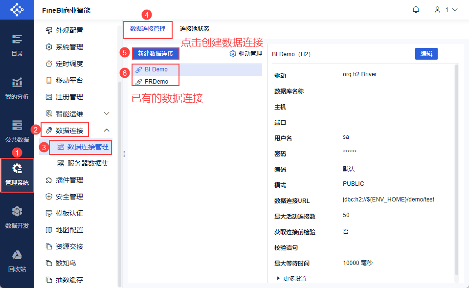 管理员登录FineBI系统,点击「管理系统>数据连接>数据连接管理」,可以「新建数据连接」和编辑已经创建的数据连接。如下图所示: