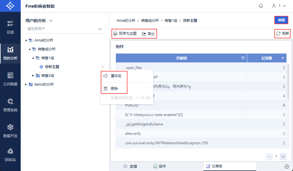 FineBI 给超级管理员提供了「用户的分析」功能,用于统一管理所有设计用户在「我的分析」下做的主题/数据/组件/仪表板。