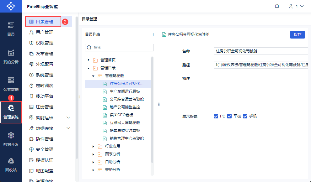 管理员登录FineBI系统,点击「管理系统>目录管理」,可对有权限的目录节点进行增删改操作。如下图所示: