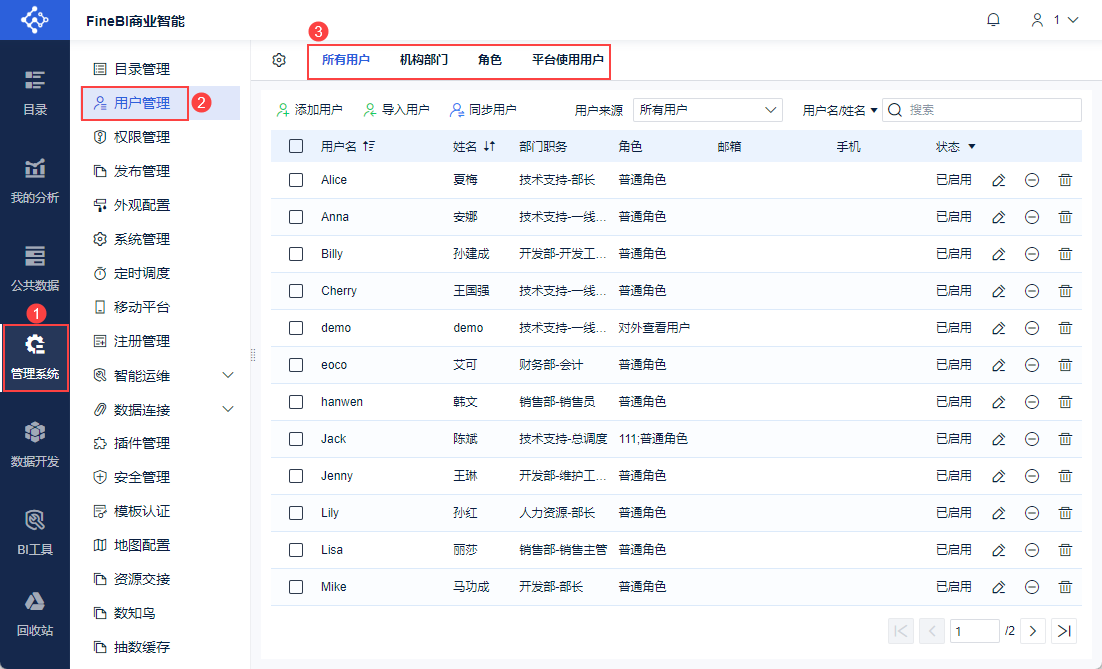 | 所有用户 | 正式系统推荐使用「同步用户」方式管理用户 开启了数据集同步后,用户信息将跟随数据集同步,动态改变、实时更新,即若数据库信息改变后,决策系统中的用户信息也会随之改变 详情请参见:同步用户 |