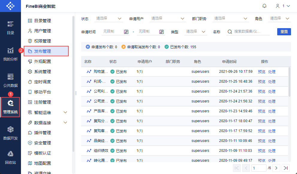 管理员登录FineBI系统,点击「管理系统>发布管理」,显示的是权限范围内申请发布的模板,管理员可快速发布到有权限的目录节点。