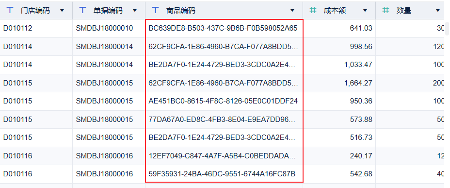 商品销售明细表只有商品编码,没有商品的名字。编码并不方便我们去查看,如下图所示: