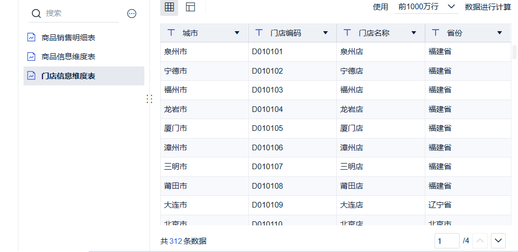 创建分析主题,并添加示例数据「门店信息维度表、商品信息维度表、商品销售明细表」