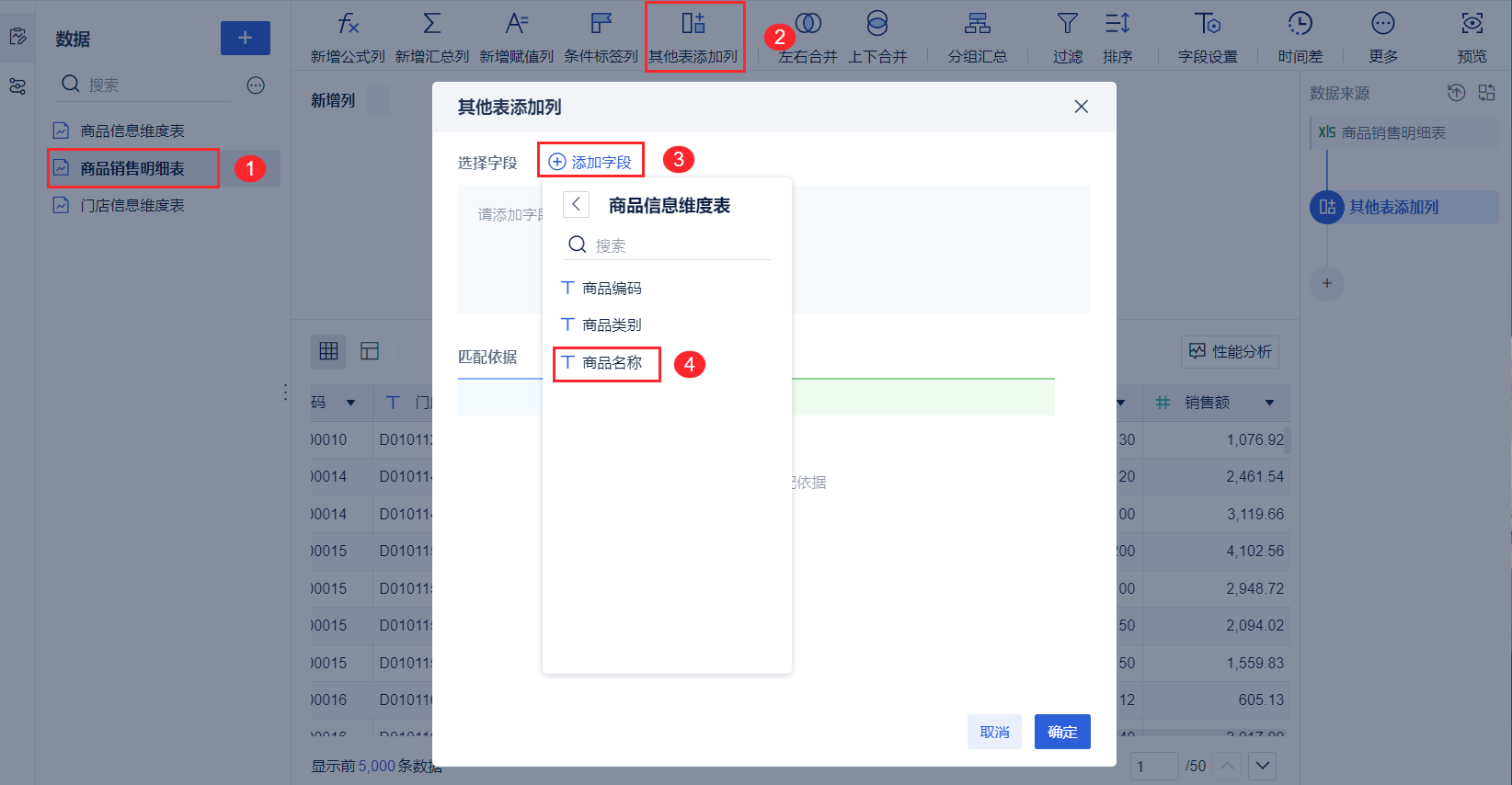 1)点击「其他表添加列」,将「商品销售明细表」中的销售额添加进来。如下图所示: