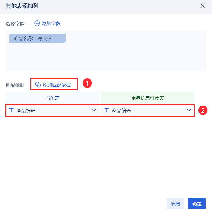 当前表与「商品信息维度表」都拥有「商品编码」字段,且该字段具有辨识度。我们添加此字段作为匹配依据,如下图所示: