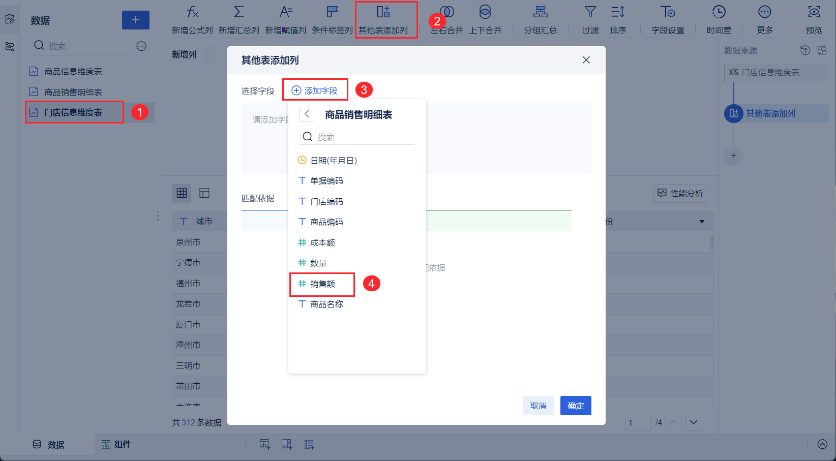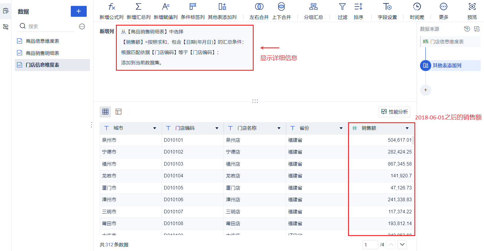 门店信息维度表包含了门店的基础信息。如果想知道每个门店的销售额,使用其他表新增列该如何做?