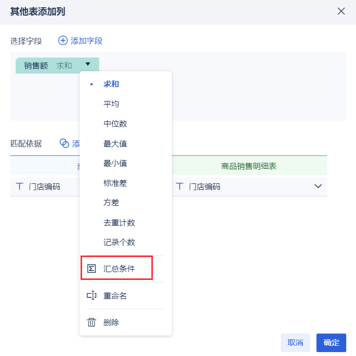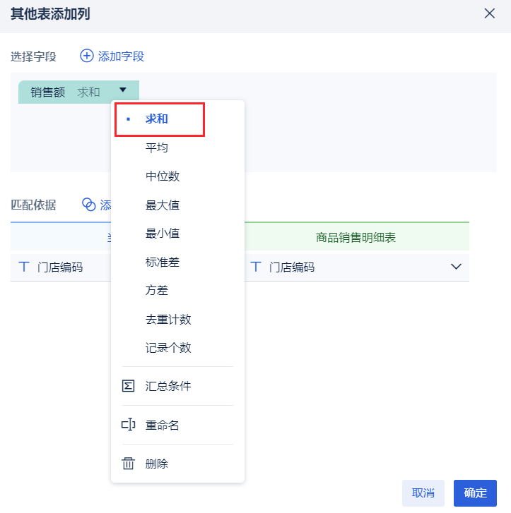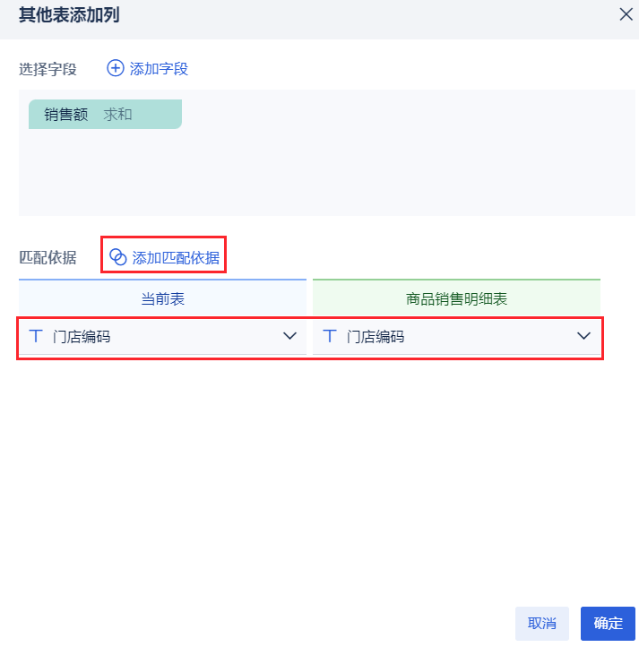 | 合并依据 | 合并的两张表存在关联的字段,合并方式相当于左合并 添加字段和合并表若有关联字段,会自动添加合并依据;也支持手动添加合并依据 | |
