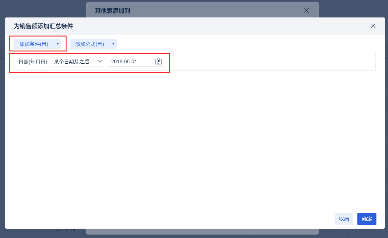 汇总条件 对符合过滤条件的值进行汇总计算,不符合的值显示为空。 添加汇总条件支持条件过滤和公式过滤。如下图所示:
