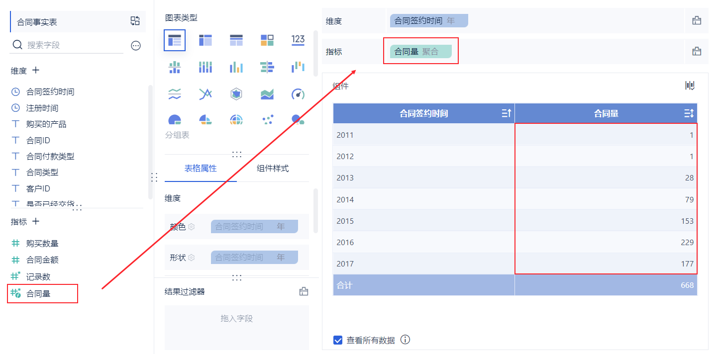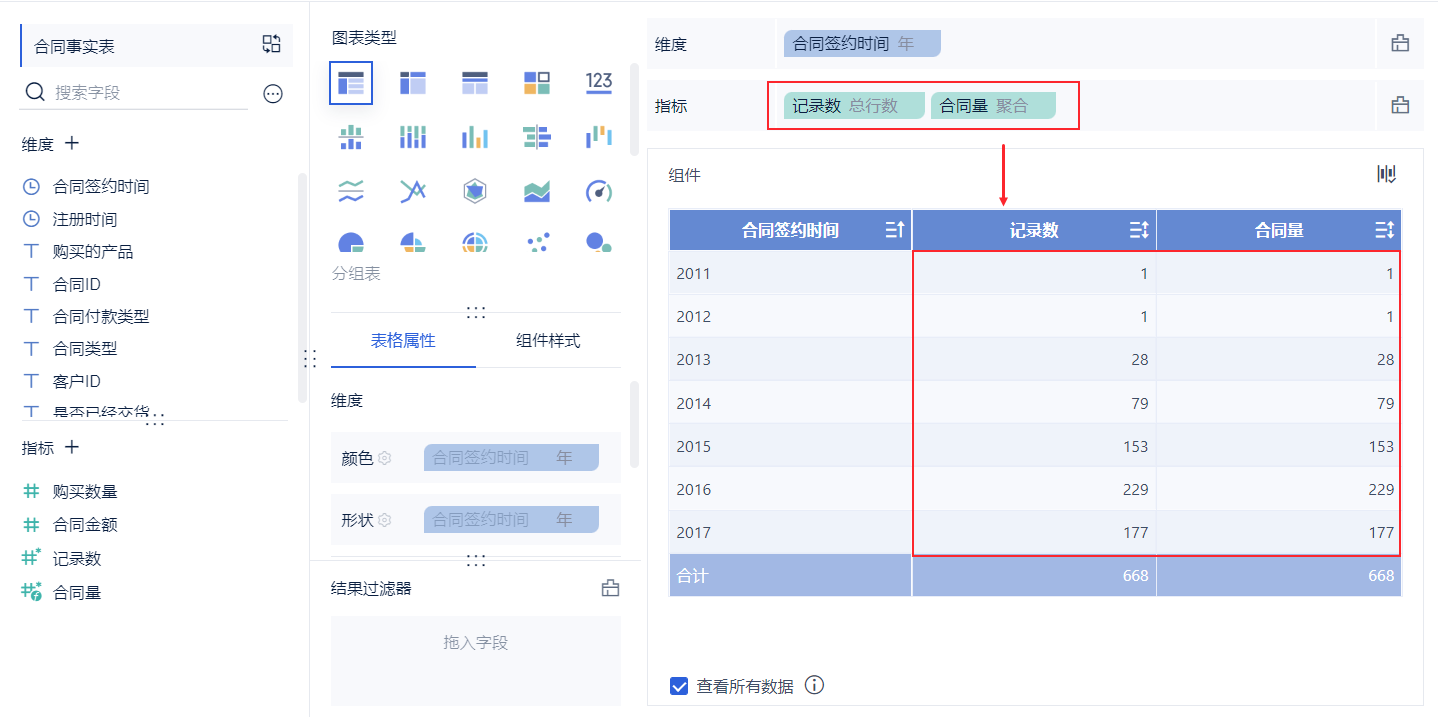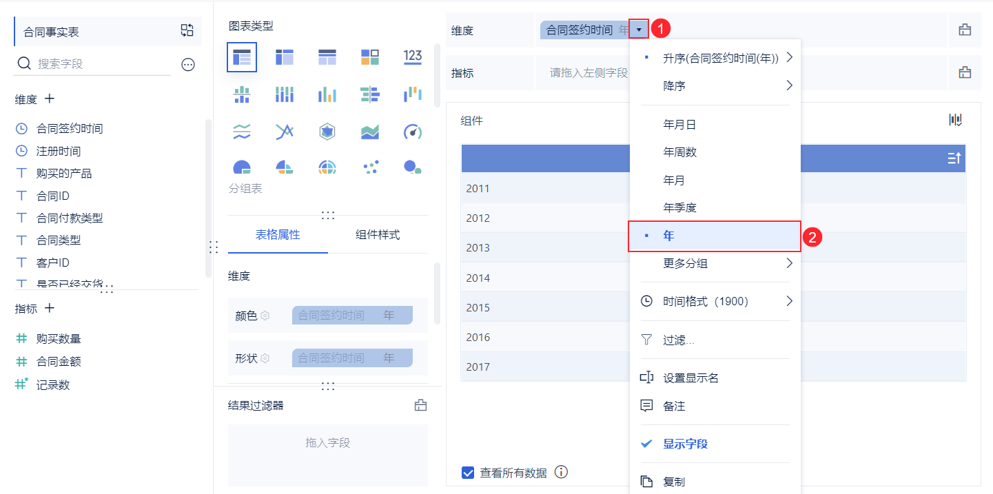 例如使用「合同事实表」,希望计算每年的合同签约数量,则首先将「合同签约时间」拖入横轴,并设置分组方式为「年」,如下图所示: