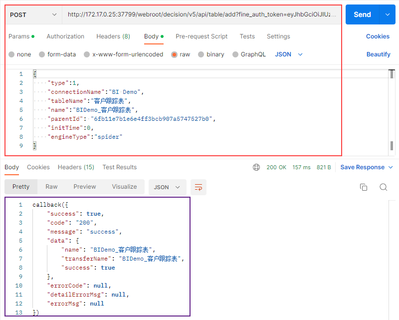 | 请求Body | { "type":1, "connectionName":"BI Demo", "tableName":"客户跟踪表", "name":"BIDemo_客户跟踪表", "parentId": "6fb11e7b1e6e4ff3bcb907a5747527b0", "initTime":0, "engineType":"spider" } |