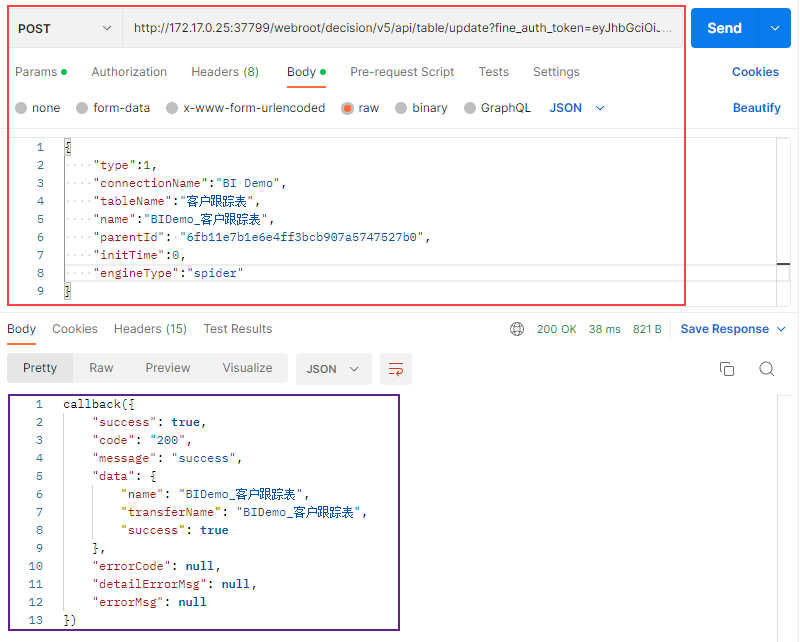 | 响应成功 | callback({ "success": true, "code": "200", "message": "success", "data": { "name": "BIDemo_客户跟踪表", "transferName": "BIDemo_客户跟踪表", "success": true }, "errorCode": null, "detailErrorMsg": null, "errorMsg": null }) |