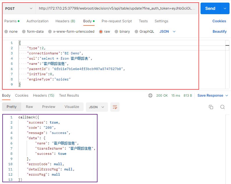 | 请求Body | { "type":2, "connectionName":"BI Demo", "sql":"select * from 客户跟踪表", "name":"客户跟踪信息", "parentId": "6fb11e7b1e6e4ff3bcb907a5747527b0", "initTime":0, "engineType":"spider" } |