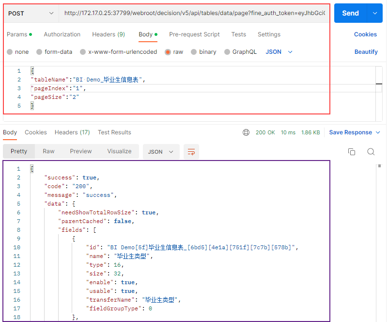 | 请求body | { "tableName":"BI Demo_毕业生信息表", "pageIndex":"1", "pageSize":"2" } |