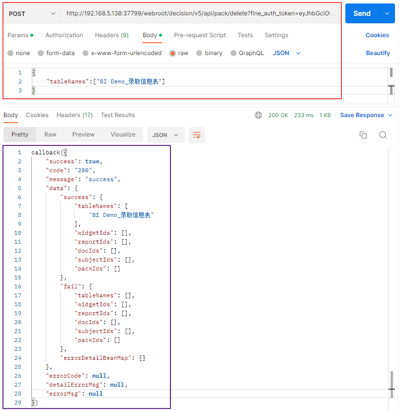 | 请求链接 | http://172.17.0.25:37799/webroot/decision/v5/api/pack/delete?fine_auth_token=xxx 注:使用接口时需要登录,需要传递token参数。 |