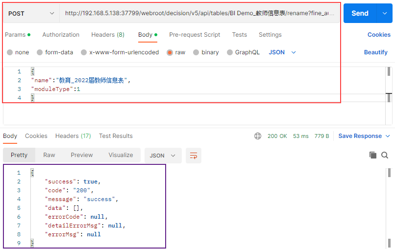 | 请求链接 | 表原始名: BI Demo_教师信息表 链接: http://192.168.5.138:37799/webroot/decision/v5/api/tables/BI Demo_教师信息表/rename?fine_auth_token=xxx 注:使用接口时需要登录,需要传递token参数。 |