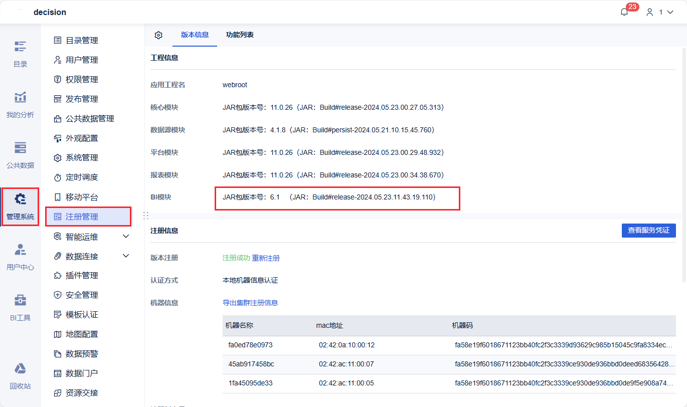 2)若已有 BI 工程,使用超管账号登陆 FineBI 系统,点击「管理系统>注册管理>版本信息」,即可查看工程的版本号。若工程版本为 6.1 以下,请参考 FineBI 版本升级 将工程升级至 6.1及以上版本。