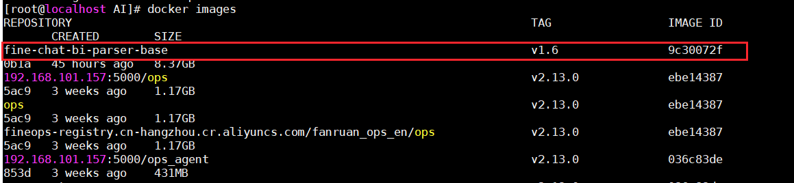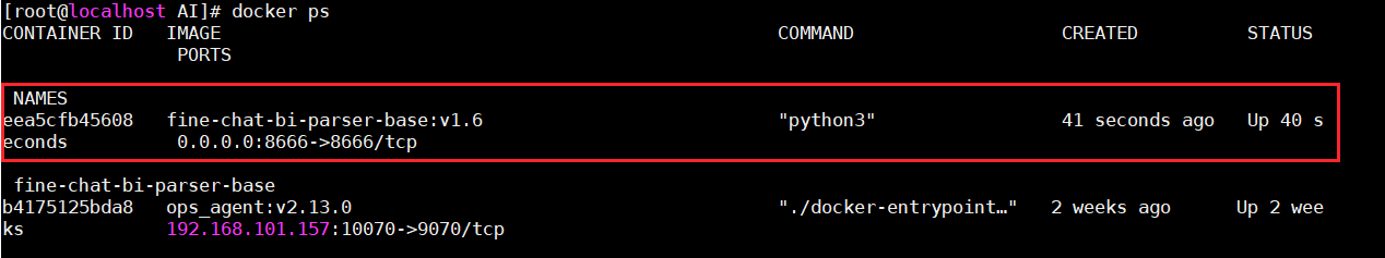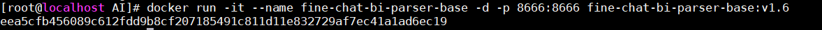 6)使用命令运行镜像,命令为:docker run -it -e TZ=Asia/Shanghai --name fine-chat-bi-parser-base -d -p 8666:8666 基础镜像名称:基础镜像版本号