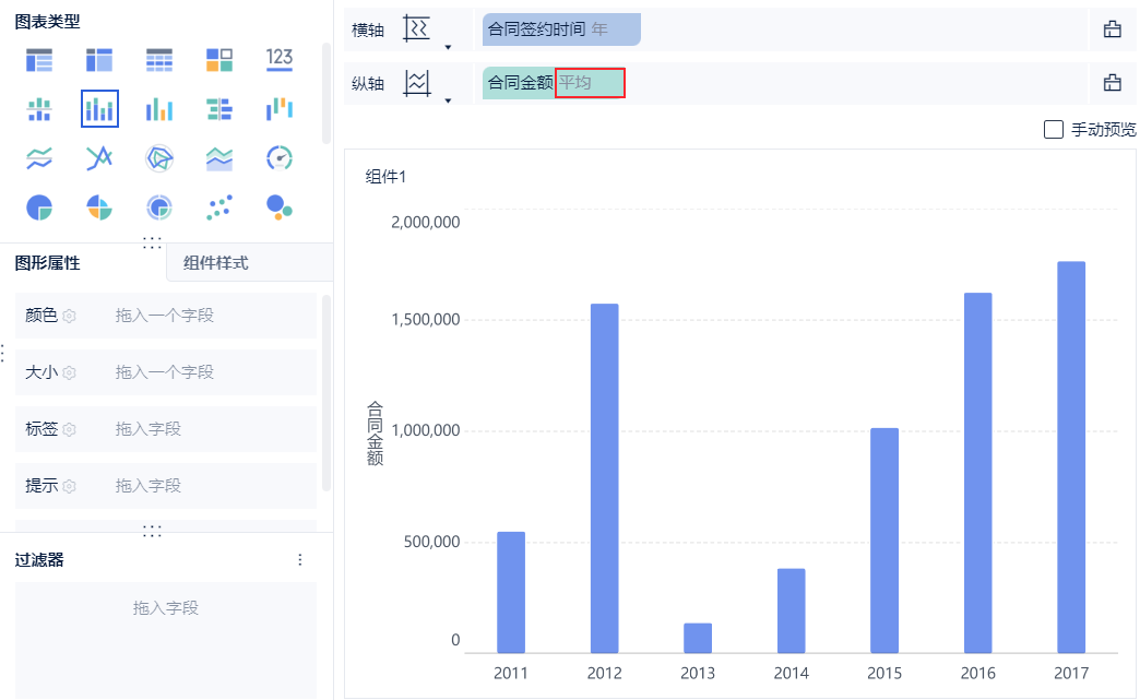 选择「合同金额」的「下拉>汇总方式>平均」,将汇总方式切换为平均,此时每个柱子表示 2011-2017 对应的每单合同金额的平均金额。如下图所示: