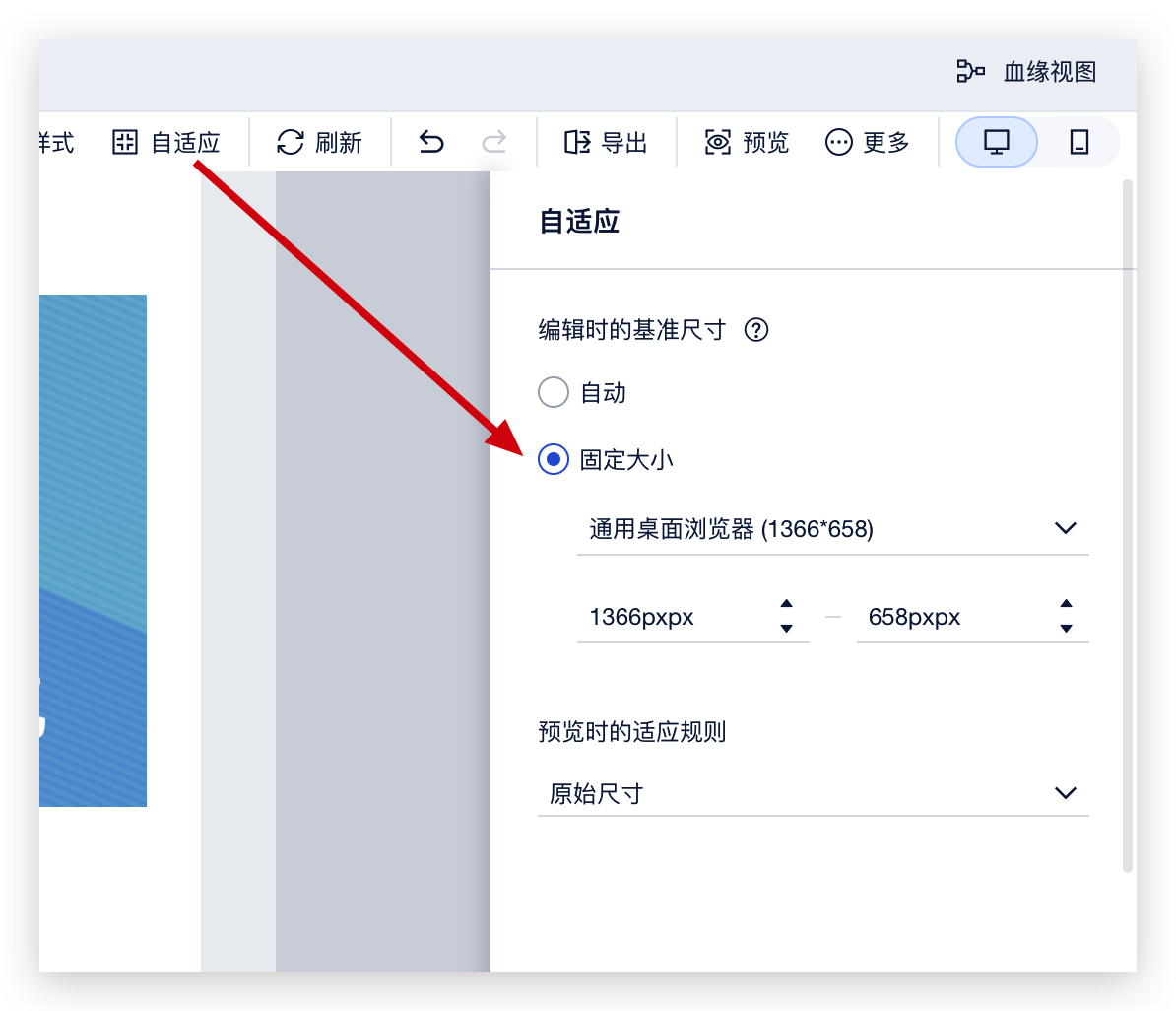 • 首先在自适应中把“编辑是的基准尺寸”改为固定大小,尺寸使用“通用桌面浏览器”。