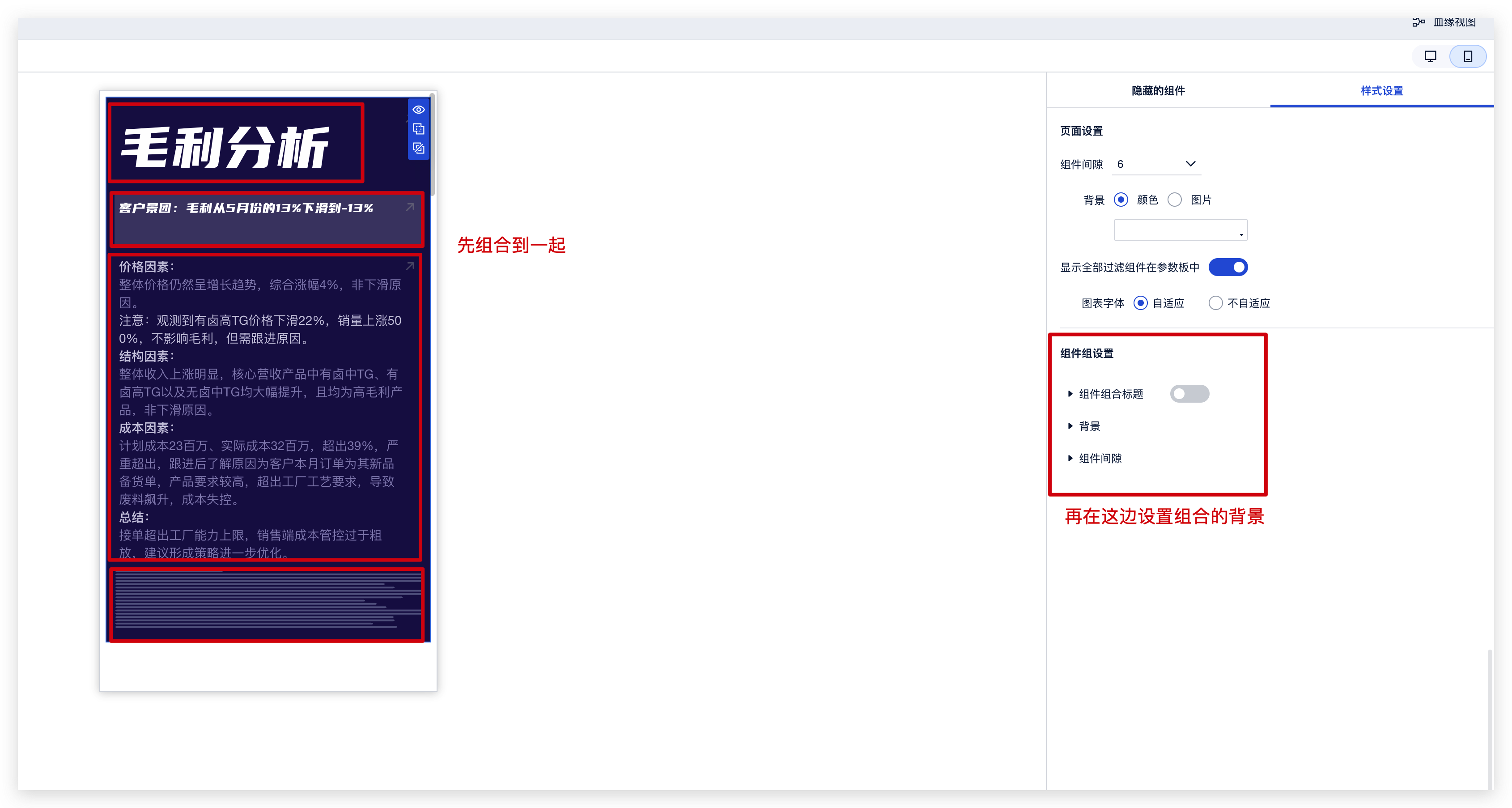 • 然后我们就像刚刚制作分析板块一样,先将用到的元素排列好,然后进行组件成组,最后再设置组合的背景