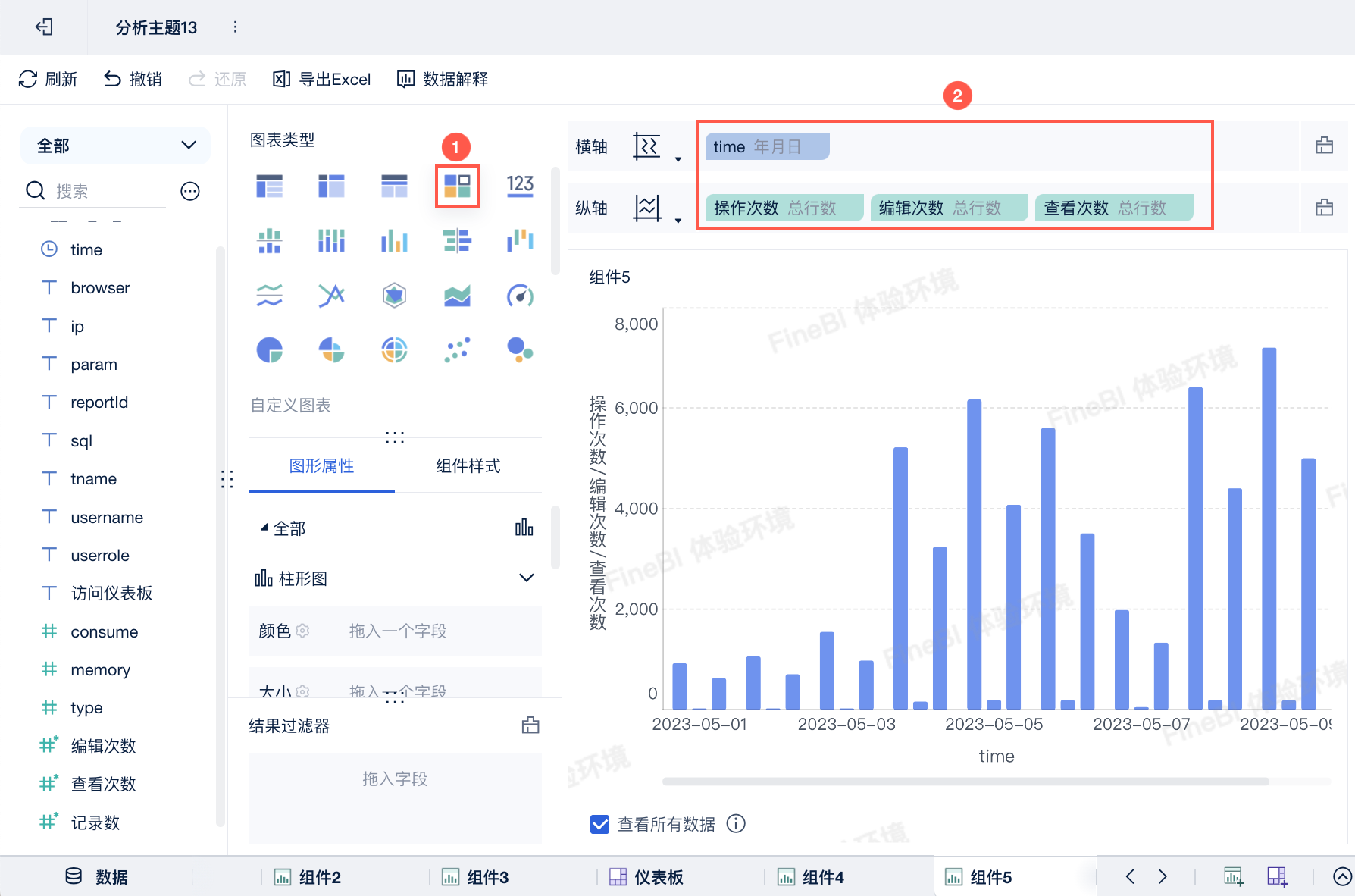 点开「编辑次数」字段,图形选择「柱形图」,步骤同上。