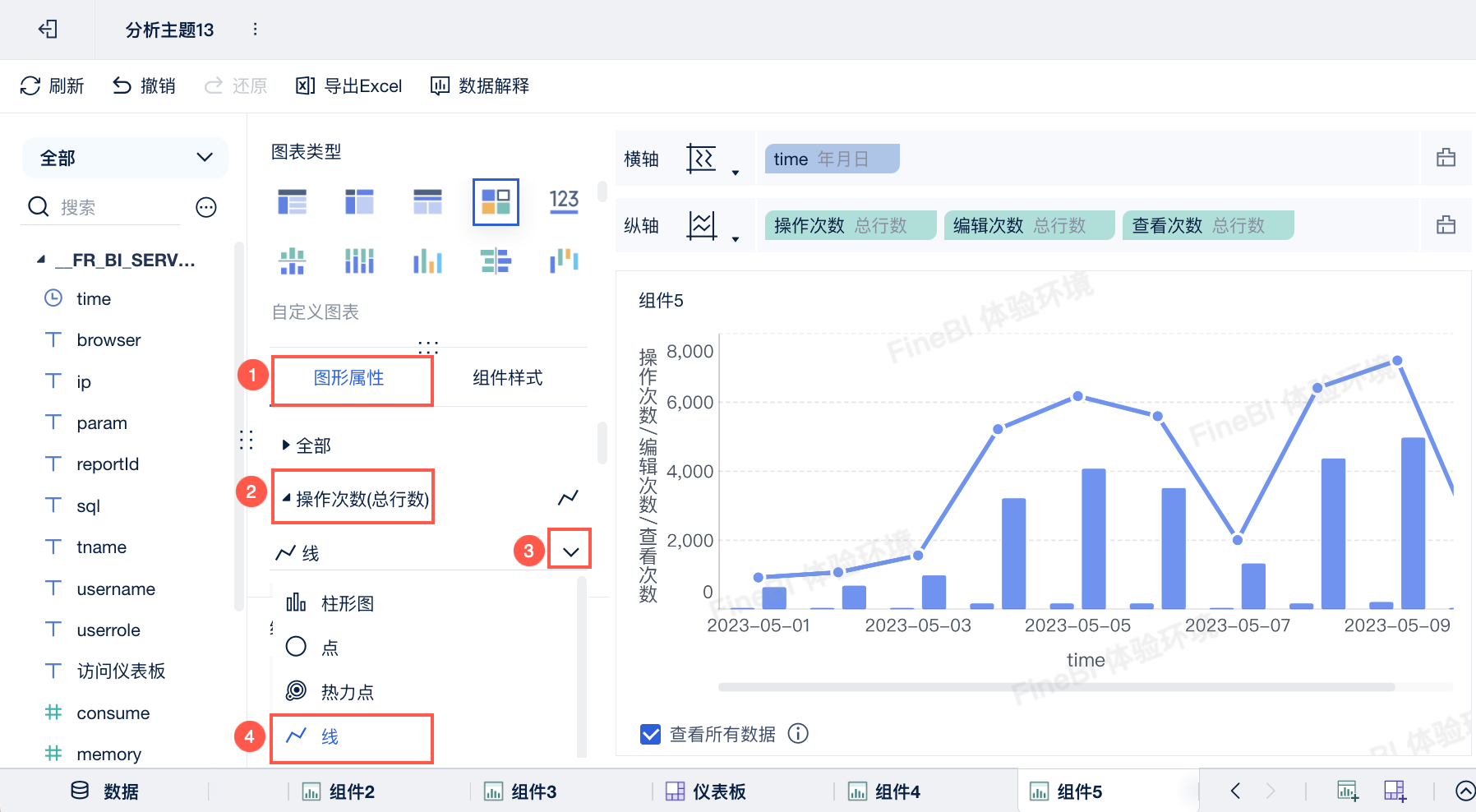5)在图形属性下,点开「操作次数」字段,图形选择「线」。如下图所示: