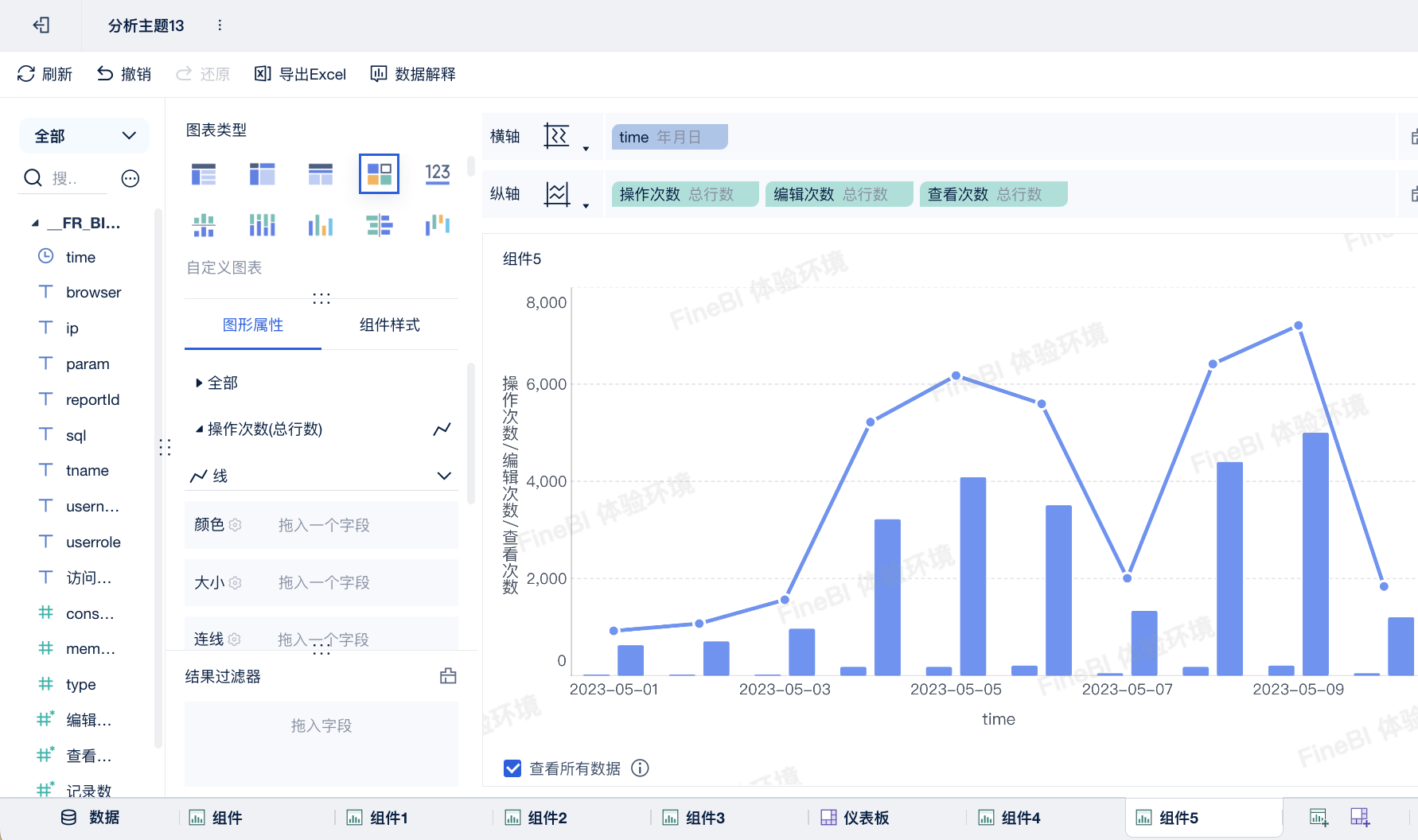 4)图表类型下选择「自定义图表」,将「time」字段拖入横轴,「记录数」、「编辑次数」、「查看次数」字段拖入纵轴,并将「记录数」字段重命名为「操作次数」。如下图所示: