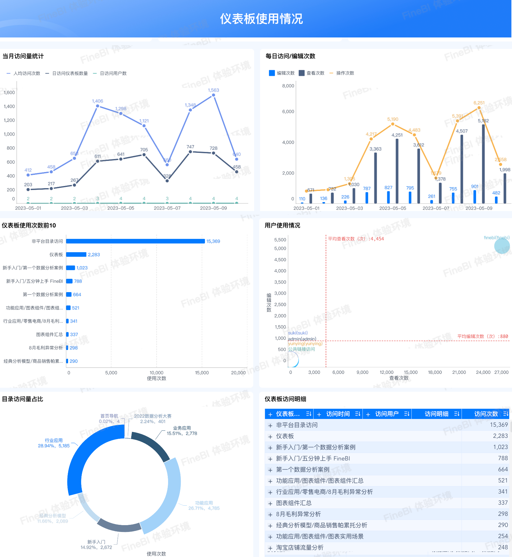 可以观察到仪表板的访问次数、查看次数、编辑次数,整体评价仪表板的活跃情况。如下图所示: