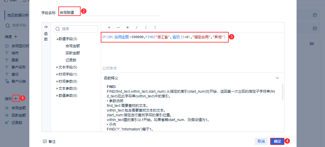 创建分析主题,上传示例数据「地区数据分析」,添加「新增公式列」并输入公式:IF(FIND("有限公司",客户名称)!=0,"有限公司",IF(FIND("大学",客户名称)!=0,"教育行业","其他")),如下图所示: