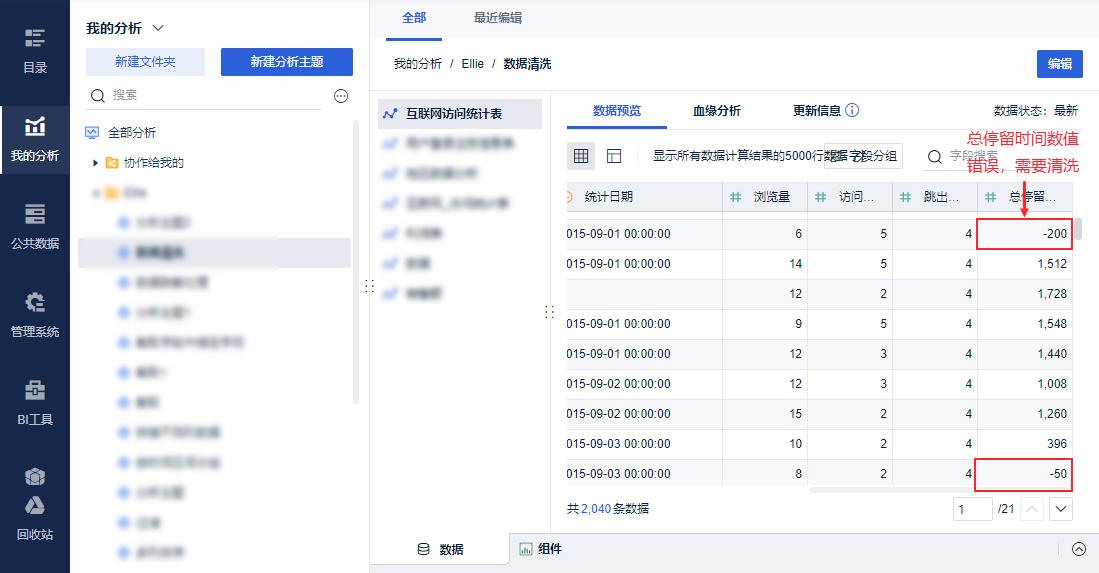 在进行数据处理时,用户经常遇到数据「逻辑值错误」的问题,例如有一张数据表,总停留时间是有负数的数据,明显这些数据是错误的,此时就需要进行数据处理,将「总停留时间」为负数的都改成「报错」进行标识。