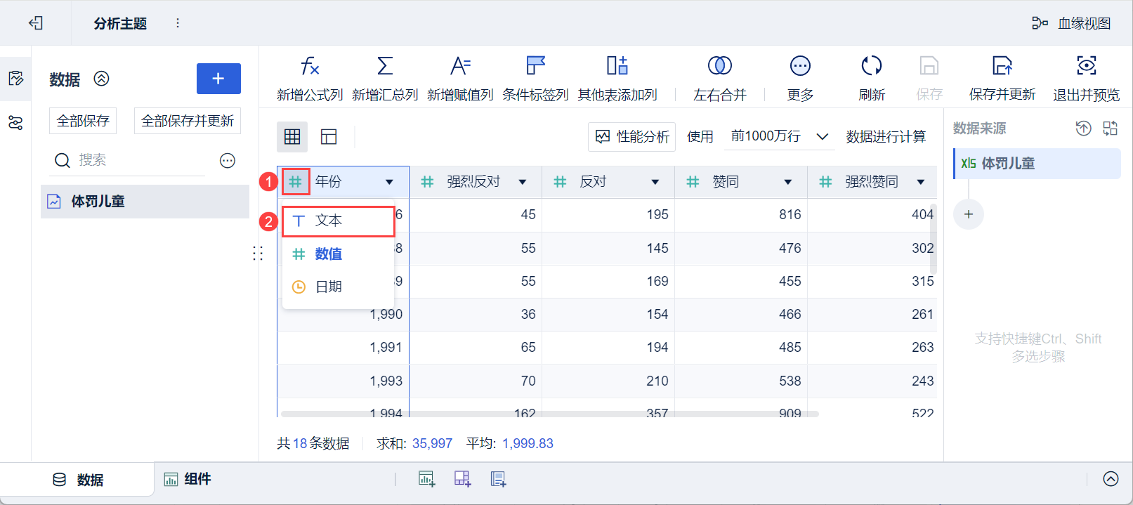 4)点击数据预览区域表头「年份」字段前的「#」,选择「T 文本」,即设置「年份」字段为文本类型,如下图所示: