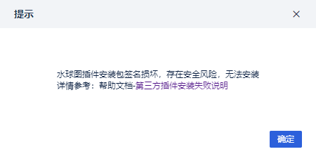下载安装/本地安装插件时,若该插件未通过完整性校验,则提示「XXX插件安装包签名损坏,存在安全风险,无法安装」。如下图所示: