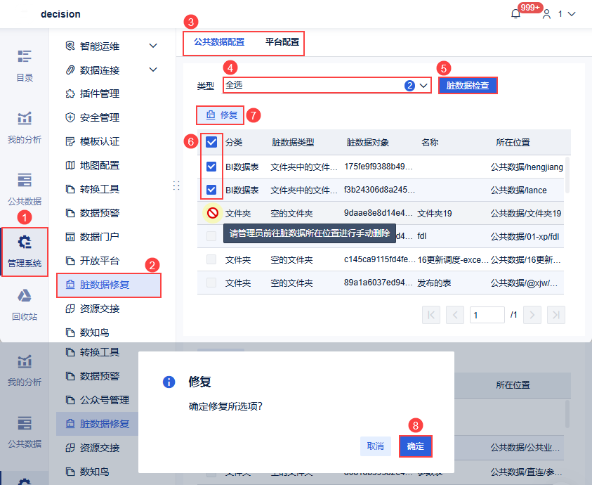 FineBI提供「脏数据修复」功能,帮助管理员排查FineBI配置中存在的脏数据,支持自动/手动修复