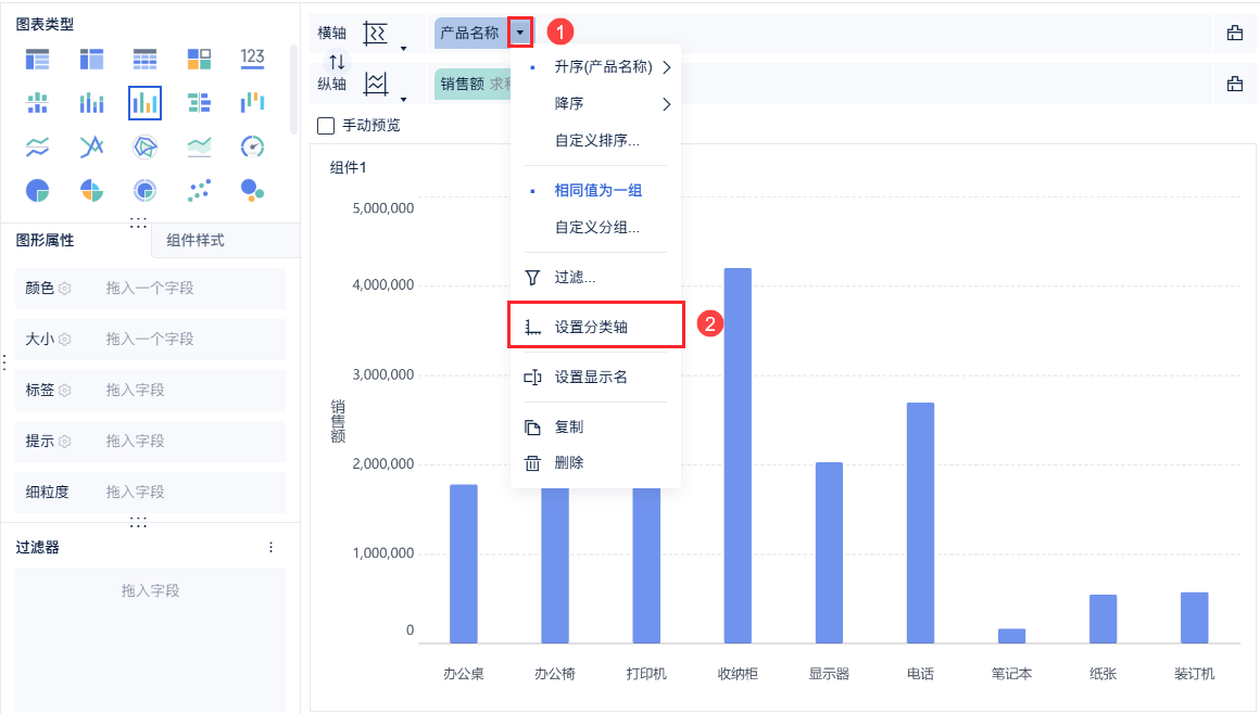 点击分类轴字段的下拉按钮,并点击「设置分类轴」,如下图所示: