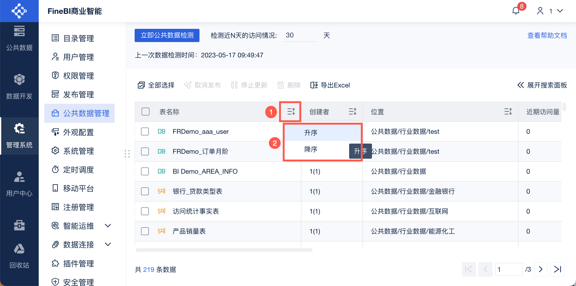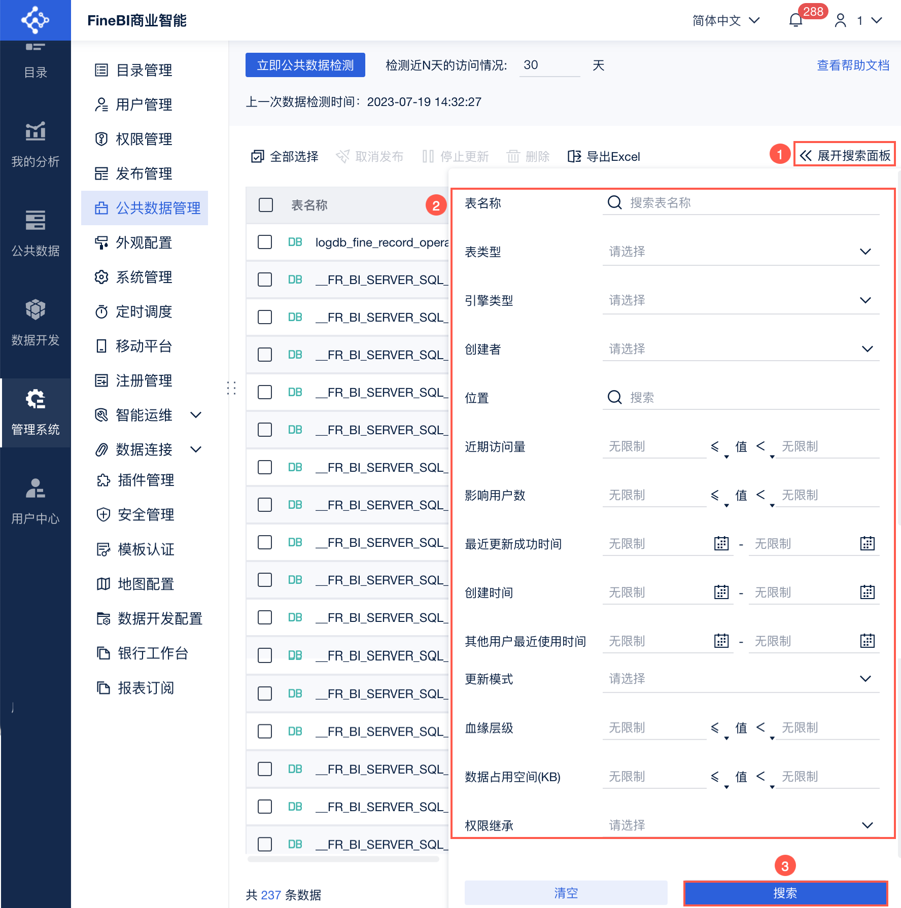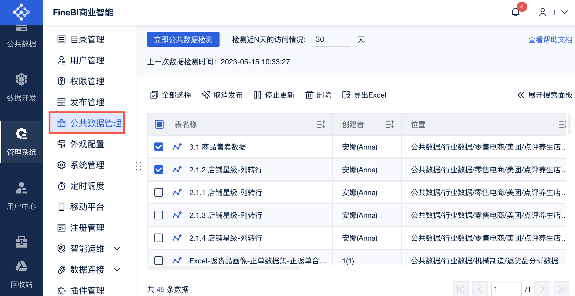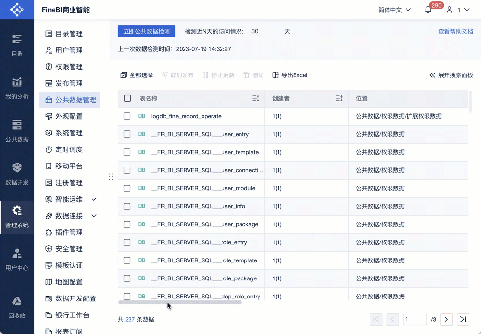 管理员登录 FineBI 系统, 点击「管理系统>公共数据管理」,点击「立即公共数据检测」,系统即会对公共数据中的所有表进行检测。