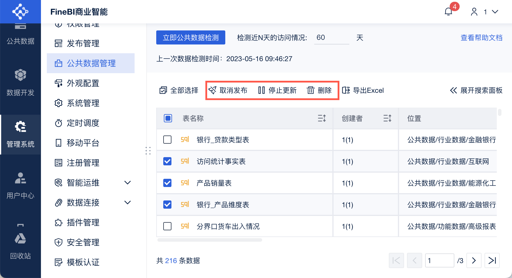 FineBI6.0 提供「公共数据管理」功能,方便管理员对公共数据进行管理操作,包括:取消发布、停止更新、删除表等。