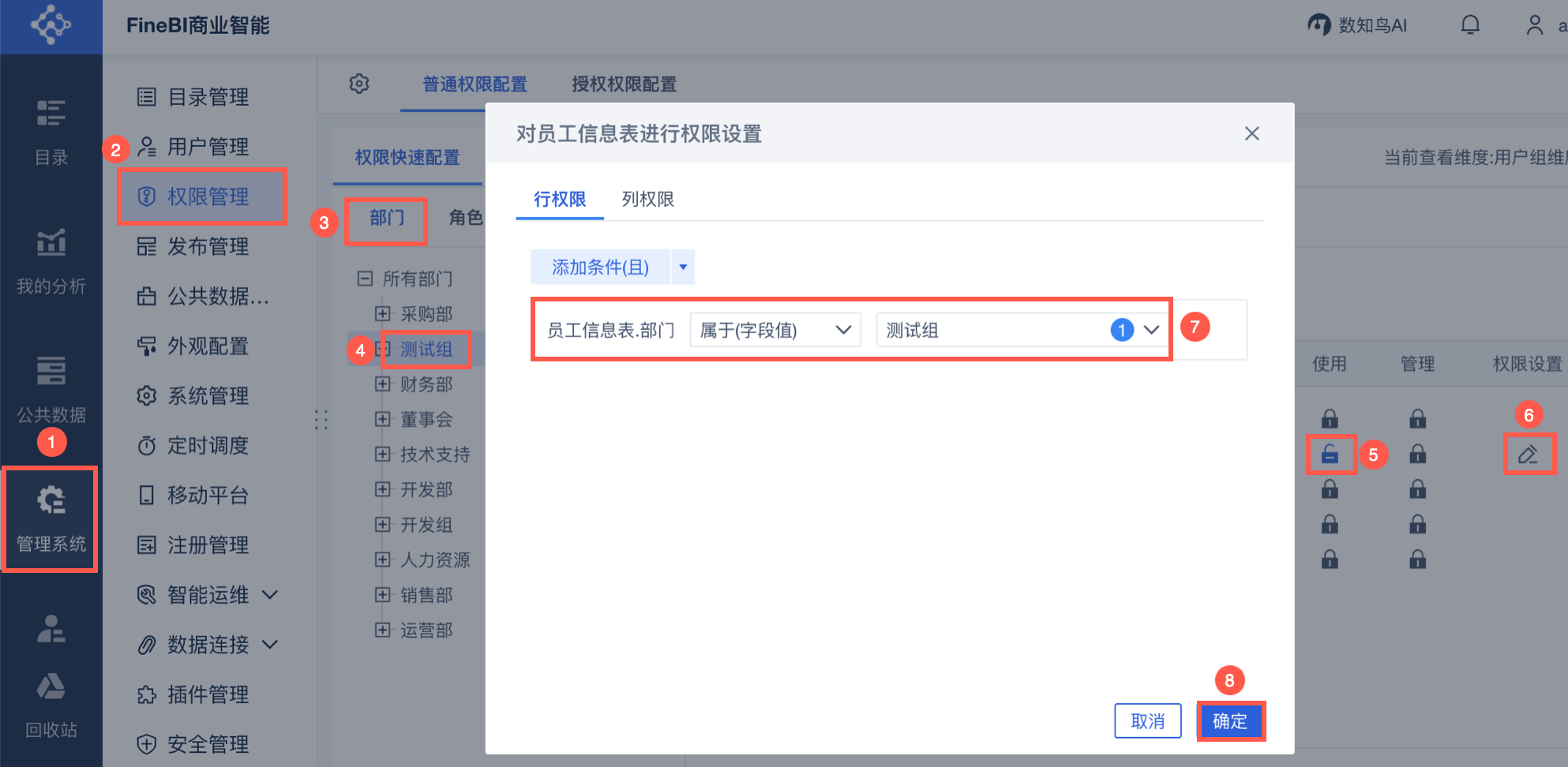 对整个测试组分配员工信息表的权限,设置行权限为员工信息表.部门=测试组。如下图所示: