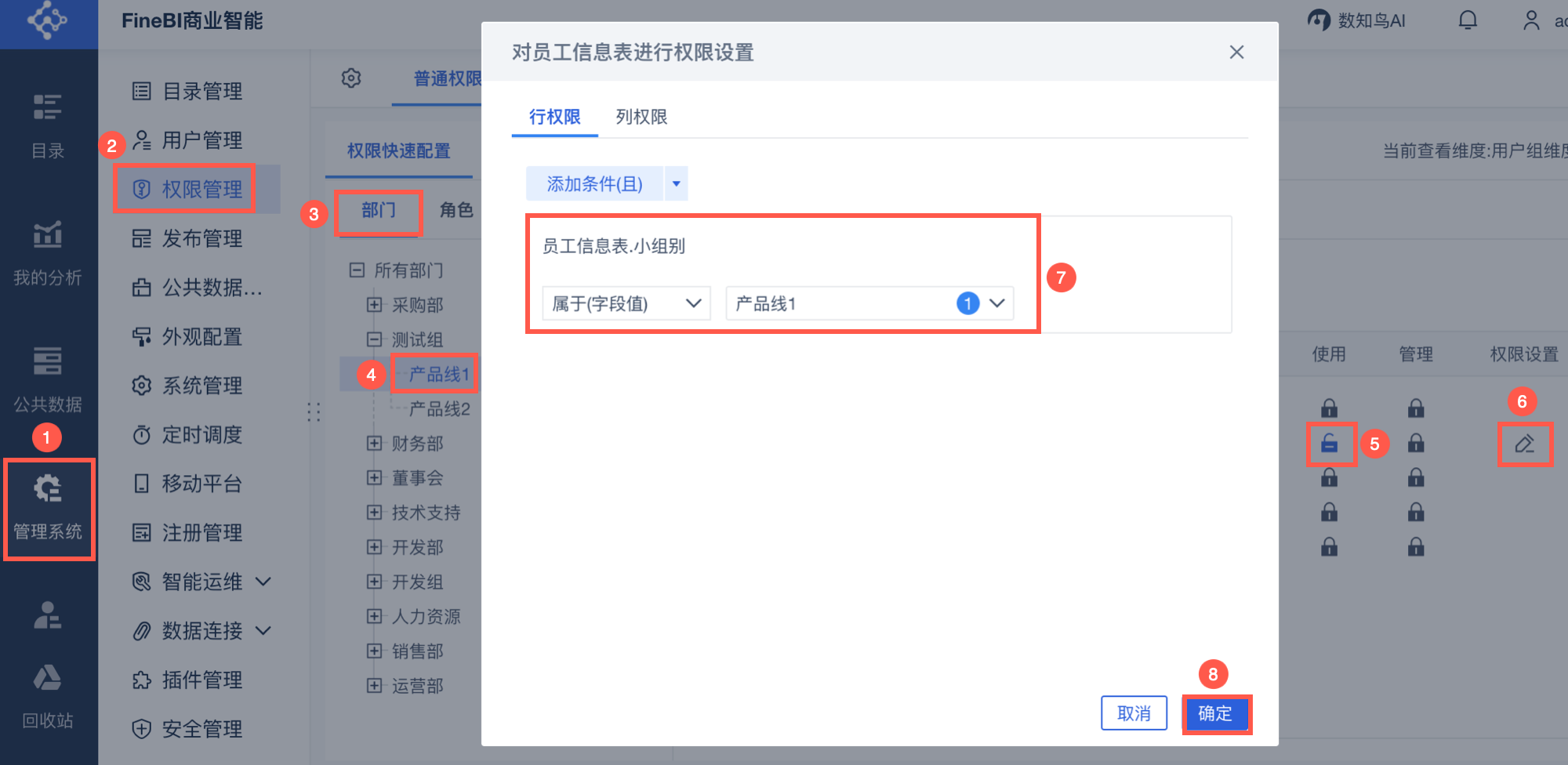 3)对测试组下的产品线 1 组分配员工信息表的权限,添加行权限为员工信息表.小组别=产品线 1 。如下图所示:
