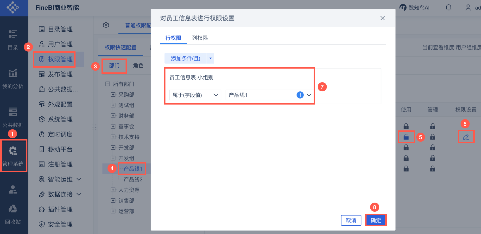 5)对开发组下的产品线 1 分配员工信息表的权限,添加行权限为员工信息表.小组别=产品线 1 。如下图所示: