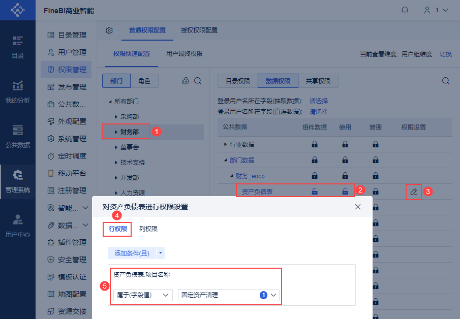 1)部门权限:部门「财务部」有公共数据「资产负债表」的「使用」权限。行权限限制为「项目名称属于固定资产清理」。