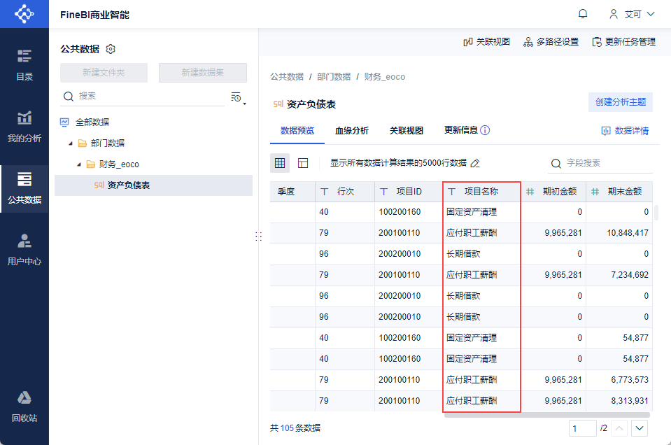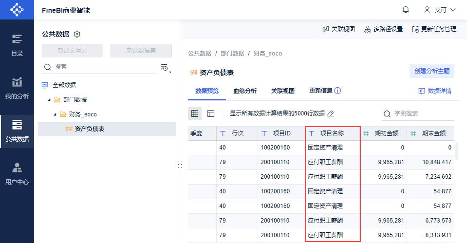 3)用户权限:用户「eoco」有公共数据「资产负债表」的「使用」权限,不限制行权限。