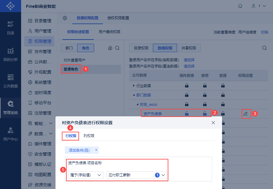 2)角色权限:角色「普通角色」有公共数据「资产负债表」的「使用」权限。行权限限制为「项目名称属于应付职工薪酬」。