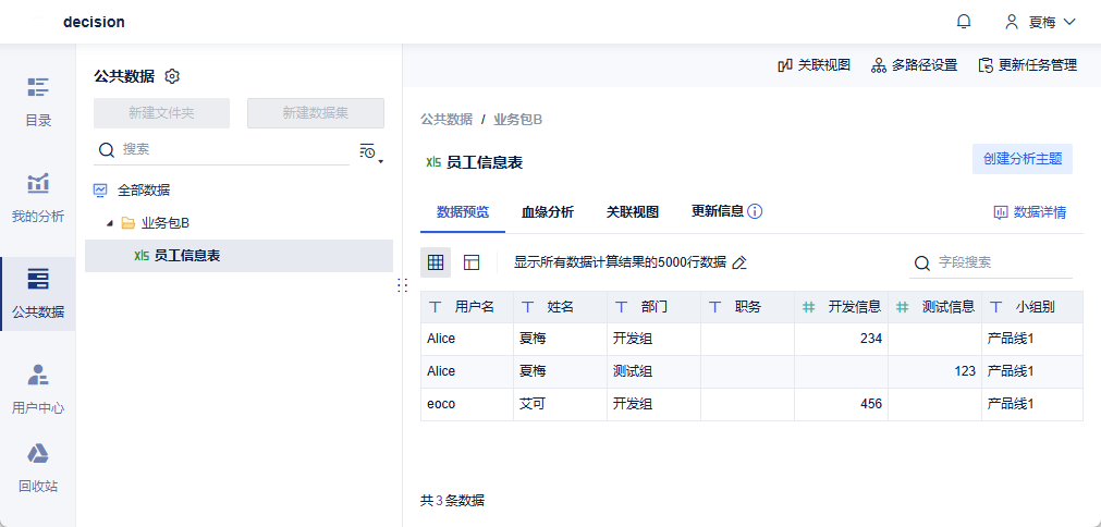 Alice 登录FineBI系统查看「员工信息表」,Alice 可以看到产品线 1 测试组和产品线 1 开发组的数据。如下图所示: