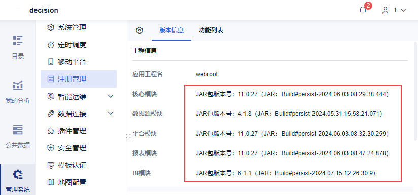 | 附件 | 工程版本信息 | 管理员登录FineBI系统,点击「管理系统>注册管理>版本信息」,查看版本信息。 请将此页面完整截图,作为附件发送