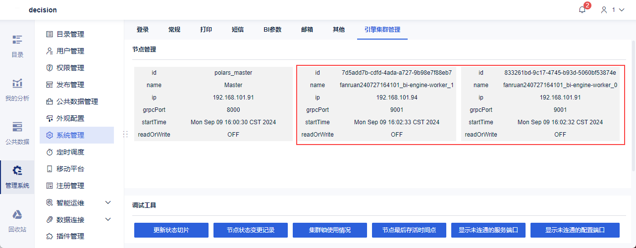 | BI引擎数 | 如待申请授权的项目类型为FineBI6.1 请提供所有项目中的bi-engine-worker引擎总数 「管理系统>系统管理>引擎集群管理」中可查看,worker数量=节点总数-1 | 若不提供该选项,则默认为1/以合同为准 若提供的引擎数超出合同范围,则以合同为准 | |