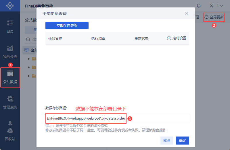 全局更新 设置中,数据存放路径不能为部署目录下。