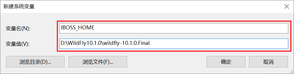 1)新建系统变量JBOSS_HOME,变量值为 WildFly 解压缩路径。如下图所示: