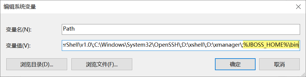 2)编辑变量 Path,新增值%JBOSS_HOME%\bin。如下图所示:
